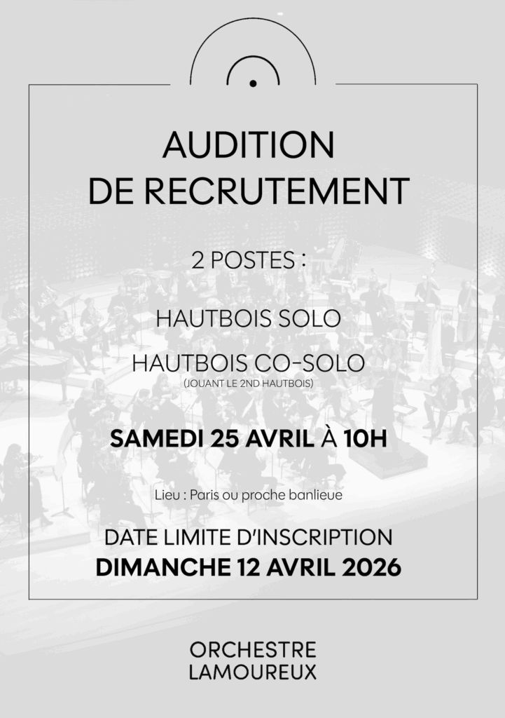 Postes de Hautbois solo et Hautbois co-solo (jouant le second hautbois) samedi 25 avril 2026Lieu à confirmer (Paris ou proche banlieue) Réglement Programme Partitions Réglement Orchestre Lamoureux – Fiche d’inscription audition de recrutement hautboisRéglement audition hautbois Avril 2026 Programme Programme – Concours de hautbois Partitions Traits d’orchestre – Concours Hautbois – Orchestre Lamoureux