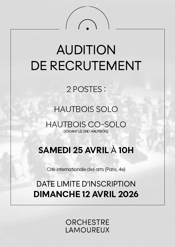 Postes de Hautbois solo et Hautbois co-solo (jouant le second hautbois) samedi 25 avril 2026Cité internationale des arts(18, rue de l’Hôtel de Ville – Paris, 4e) Réglement Programme Partitions Réglement Orchestre Lamoureux – Fiche d’inscription audition de recrutement hautboisRéglement audition hautbois Avril 2026 Programme Programme – Concours de hautbois Partitions Traits d’orchestre – Concours Hautbois – Orchestre Lamoureux